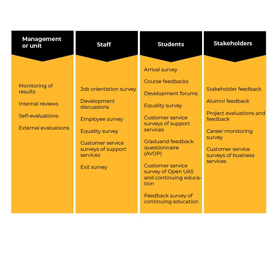 At the evaluation stage, the direction and results of our operations are monitored and evaluated. Involving students, staff, and stakeholders in the evaluation of operations promotes commitment and possibilities to influence. The data from our evaluation and feedback system, together with the monitoring of results, play a key role in steering operational development at all levels of the organisation.