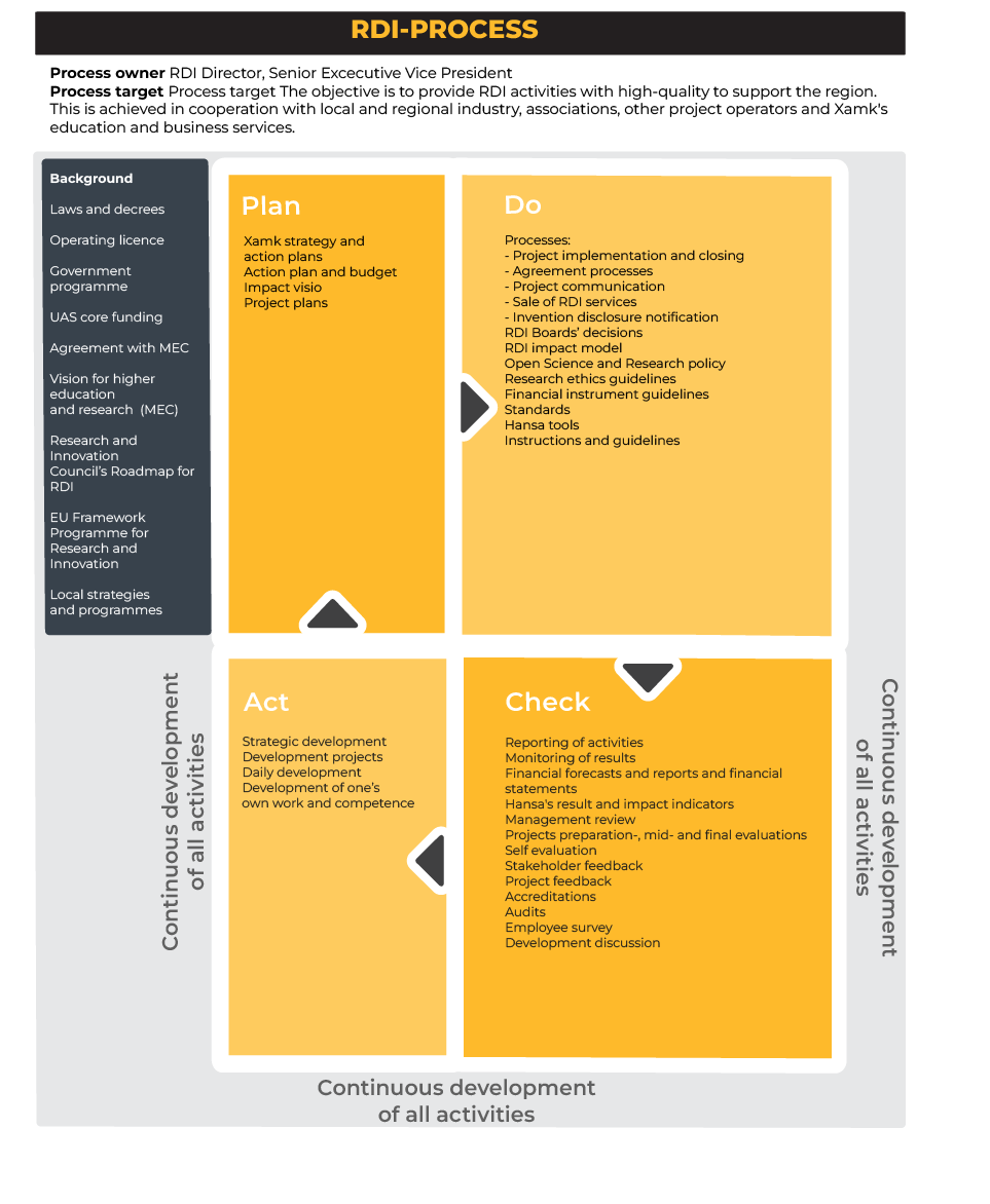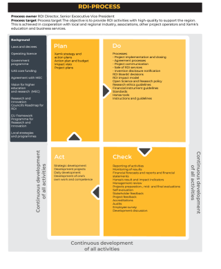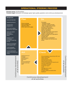 The images below (Figures 4 and 6) illustrate the quality management methods for education and RDI activities. The processes are based on the principle of continuous development, and each has a designated owner and target.