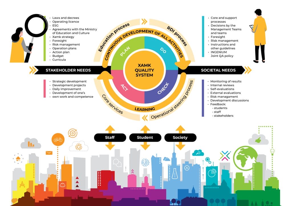 The development of Xamk’s quality system and its various aspects follows the Plan-Do-Check-Act principle of continuous development. We use common methods to maintain, evaluate, and improve quality, which are integrated into our quality system.