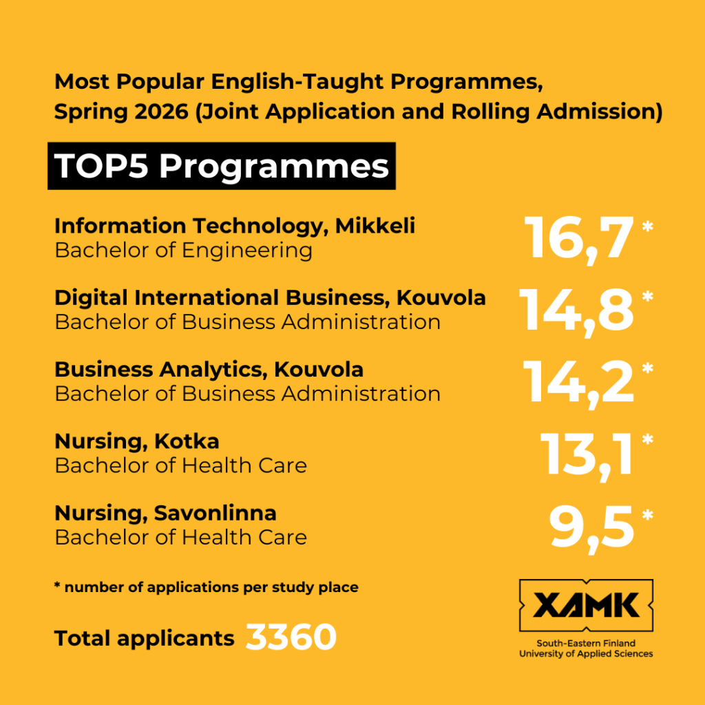 Teaching in the English-language degree programmes will begin in autumn 2026, regardless of which application process the study place was received from. The next Xamk Rolling Admission round for English-language programmes will open on 15 May 2026.