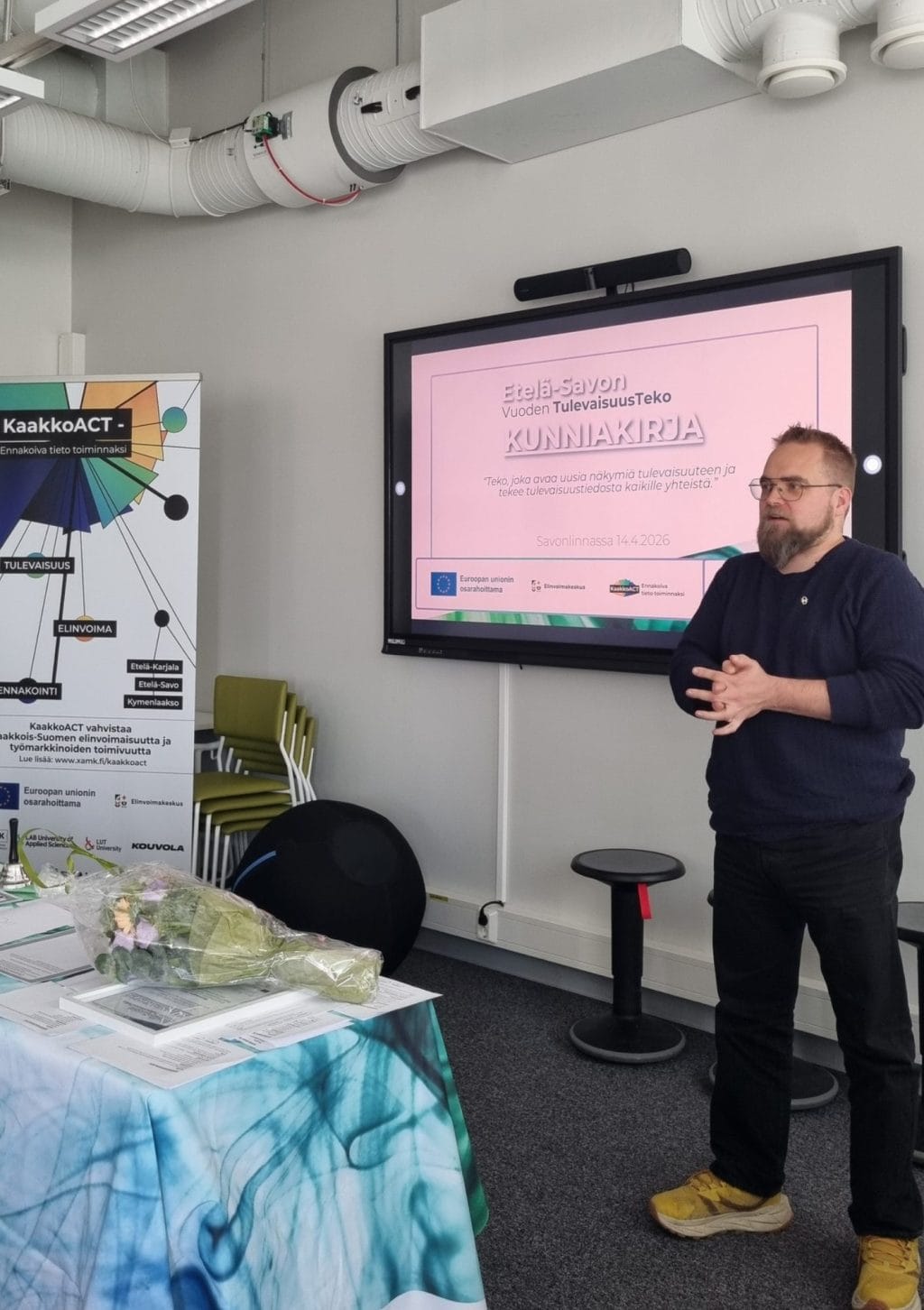 Savonlinnassa järjestettiin Etelä-Savon työmarkkinoiden Tulevaisuusverstas 14.4.2026, jossa Etelä-Savon Vuoden TulevaisuusTeko-kunniamaininnan voittaja julkistettiin. Tapahtuma oli osa Kaakon maakunnat läpikiertävää Tulevaisuusverstas-kiertuetta.