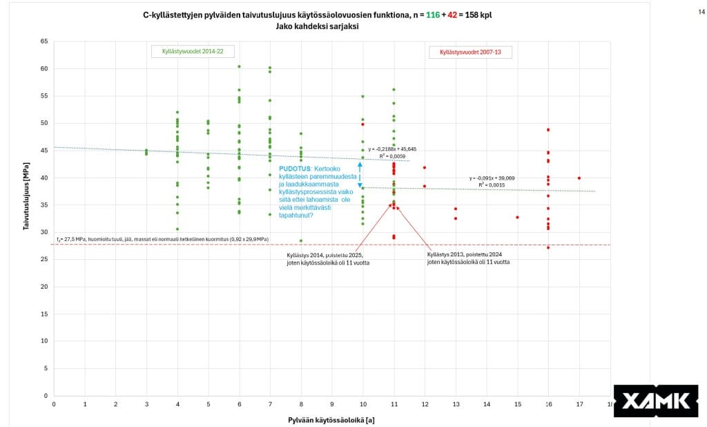 Kuva 4. Testattujen C-kyllästettyjen pylväiden taivutuslujuudet käyttöiän funktiona. Ryhmät on jaettu kyllästysajanjakson mukaan (2007–2013 ja 2014–22).