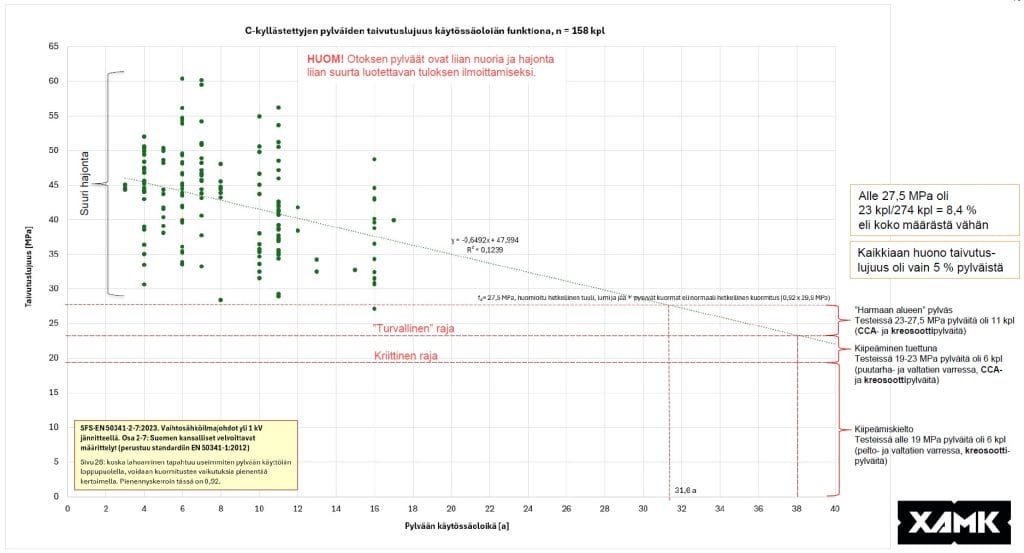 Kuva 5. Testattujen C-kyllästettyjen pylväiden taivutuslujuudet käyttöiän funktiona ja arvio käyttöiästä. Yhdisettty aineisto.
