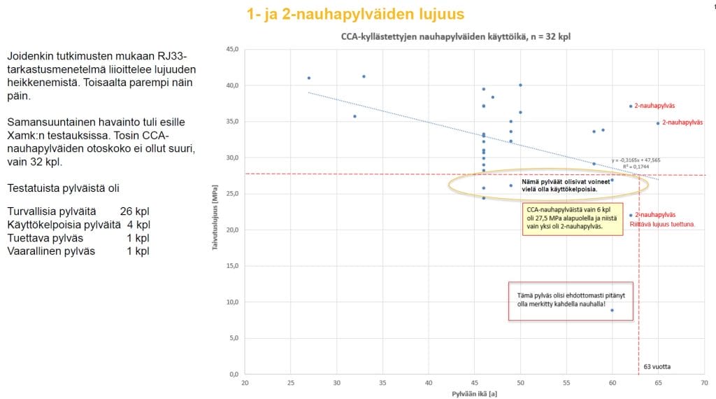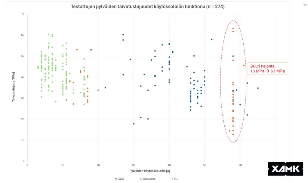 Hyväksytysti testattujen pylväiden (riittävä data kuten kyllästysvuosi, käyttövuodet yms.) kokonaismäärä on 274 pylvästä, joka todennäköisesti on yksi määrällisesti suurimmista täysimittaisten pylväiden testauksista kautta aikojen. Suuri pylväiden määrä parantaa tilastollista merkittävyyttä ja lisää luotettavuutta tuloksiin.