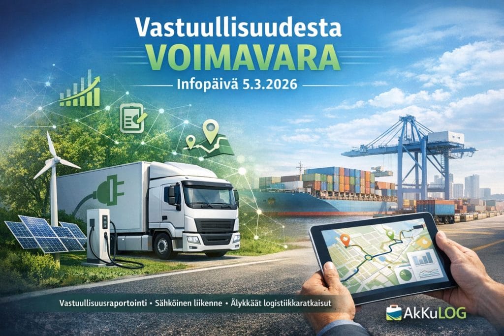 Tervetuloa mukaan AkKuLOG-hankkeen ja kumppaneiden järjestämään Vastuullisuudesta voimavara ‑infopäivään! Tilaisuus tarjoaa pk-yrityksille käytännönläheistä tietoa siitä, miten vastuullisuusraportointi, raskaan liikenteen sähköistyminen ja älykkäät logistiikkaratkaisut voivat tukea liiketoimintaa ja vahvistaa kilpailukykyä.