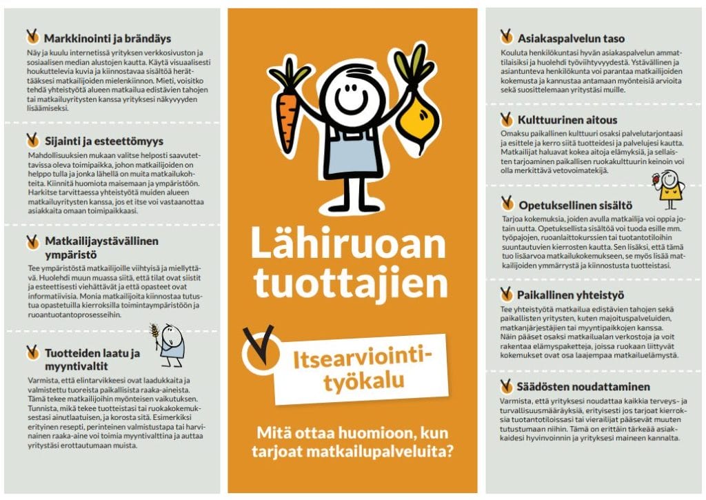 Lähiruoantuottajille suunnattu itsearviointityökalu on käytännönläheinen apuväline, jonka avulla voi arvioida valmiutta vastaanottaa vierailijoita ja tarjota matkailupalveluita.
