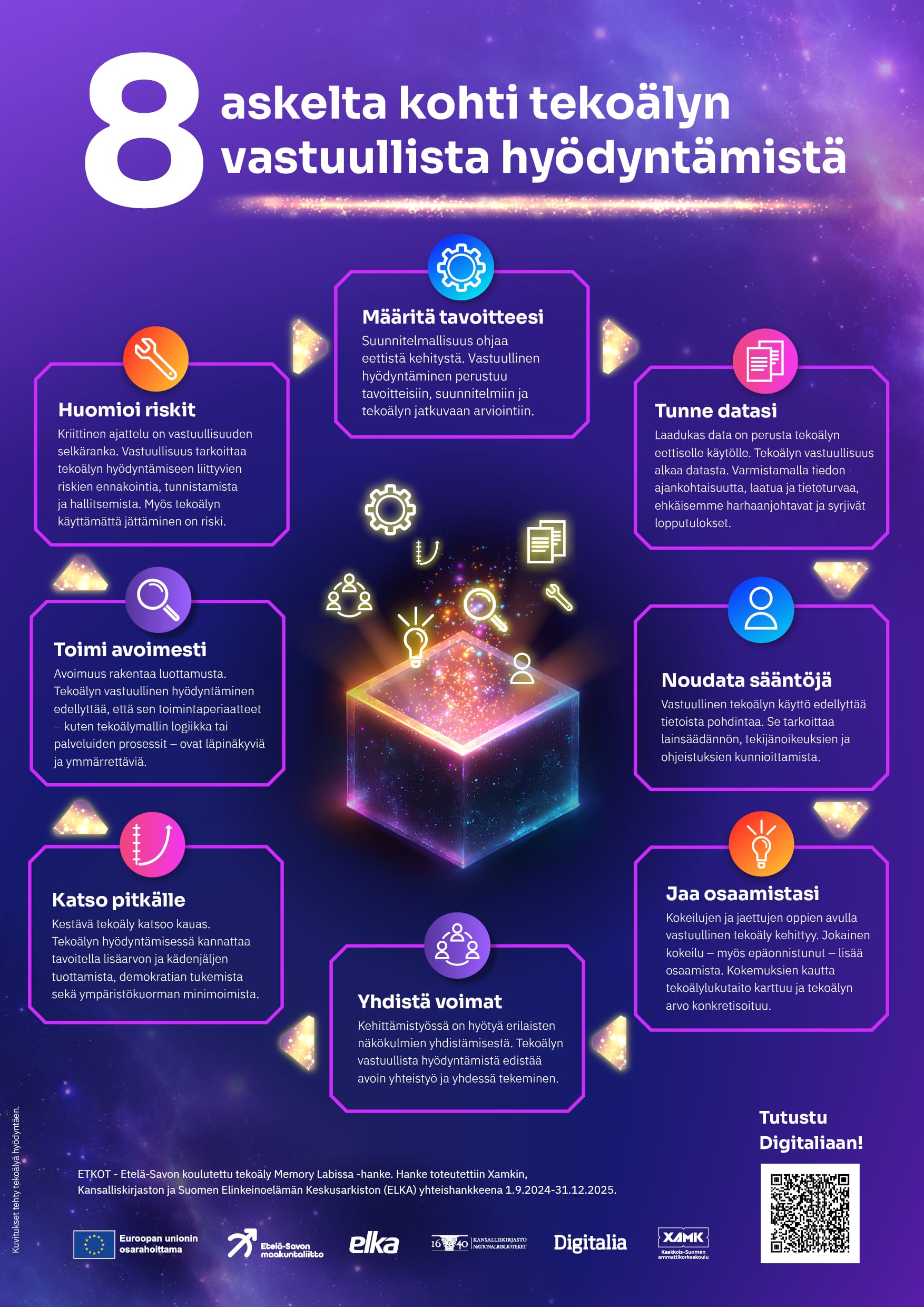 - Edistetään tekoälyn vastuullista hyödyntämistä ja tuetaan tekoälypohjaisten palveluiden kestävämpää kehittämistä Memory Labissa ja Etelä-Savossa
