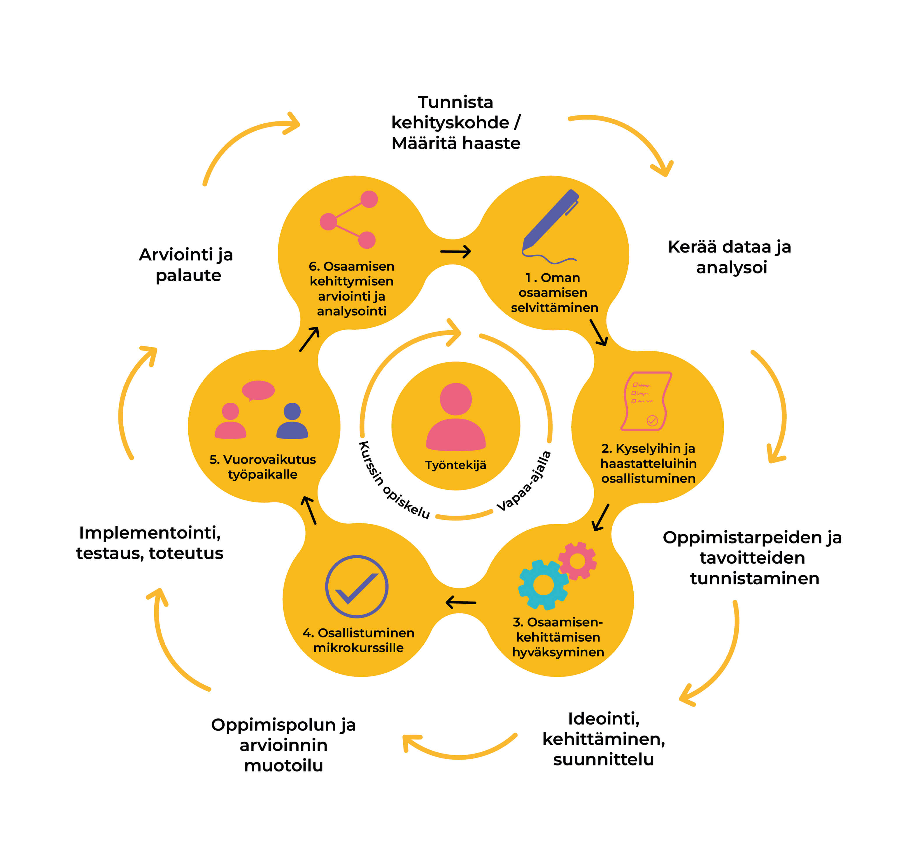 - Muotoilun tuloksena syntyneiden lyhyiden täsmäkoulutusten kokeilu verkossa, työpaikalla sekä työpajoissa.