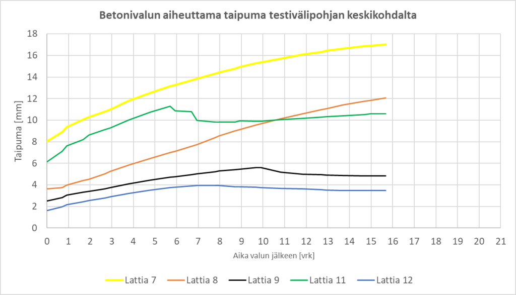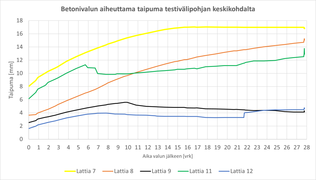 Testilattiat, pintavalu tehty 13.1.2026, ominaistaajuus- ja taipumamittauksia tehdään, kun valusta kulunut neljä viikkoa. Tällä hetkellä mitataan rakenteen taipumaa lattian keskikohdalta.