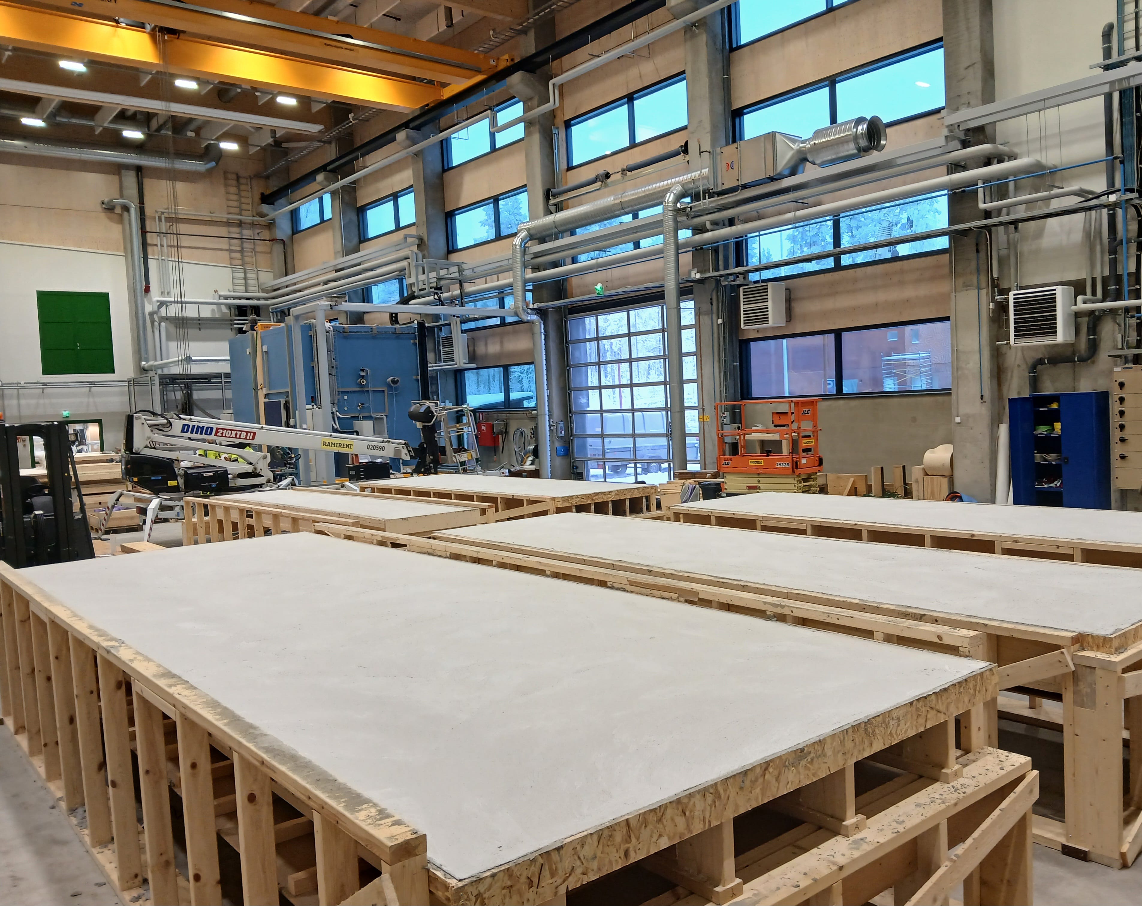 Testilattiat, pintavalu tehty 13.1.2026, ominaistaajuus- ja taipumamittauksia tehdään, kun valusta kulunut neljä viikkoa. Tällä hetkellä mitataan rakenteen taipumaa lattian keskikohdalta.