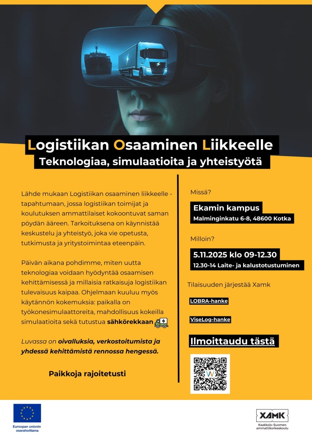 ViseLog-hankkeen järjestämä Logistiikan Osaaminen Liikkeelle -tapahtuma kokosi marraskuussa logistiikka-alan yritysten edustajia, koulutuksen järjestäjiä, opettajia ja asiantuntijoita saman katon alle pohtimaan alan tulevaisuutta. Päivän kantavana ajatuksena oli, miten vihreä siirtymä, uudet energiaratkaisut ja simulaatioteknologiat voidaan kääntää konkreettiseksi osaamiseksi ja kilpailukyvyksi niin yrityksissä kuin koulutuksessa.