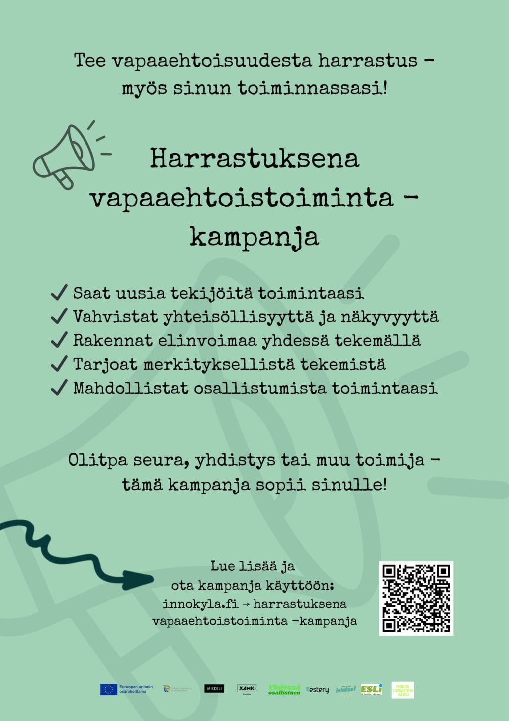 Tavoitteena on vahvistaa kansalaistoiminnan edellytyksiä, vahvistaa yhteisöllisyyttä ja hyvinvointia sekä lisätä kokemusta yhteisöön kuulumisesta.