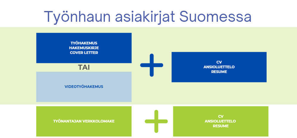 Alla olevasta kuvasta näet listaamamme työnhaun asiakirjat Suomessa. Yleisimmät niistä ovat CV ja työhakemus, mutta myös muiden voit tuoda omaa osaamistasi hyvin esiin. Muun muassa avoimella työhakemuksella osoitat aktiivisuuttasi ja videotyöhakemuksen avulla voit tuoda esiin myös kielitaitoasi.