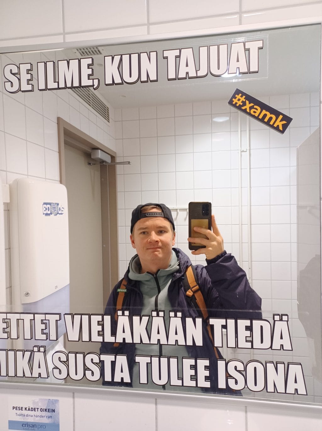 Koulun penkkiin päädyin takaisin pitkän tauon jälkeen syksyllä 2023. Olin ollut jo useita vuosia työelämässä, kun sain kipinän lähteä opiskelemaan ja ensisijaiseksi hakukohteeksi valikoitui ohjelmistotekniikka, johon pääsinkin ensiyrittämällä sisään. Ala ei ollut itselleni entuudestaan tuttu, mutta valitsin sen osittain siksi että sitä opetettiin Mikkelissä lähiopintoina, mikä mahdollistaa jääpallon pelaamisen opiskelujen ohella, mutta ennen kaikkea sen monipuolisuuden takia. Tutkinnossa käsitellään ohjelmoinnin lisäksi myös paljon IT-alaa yleisesti ja se tarjoaa hyvät työkalut itsensä kehittämiseen ammatillisesti ja uskonkin vahvasti, että tämä tutkinto auttaa tulevaisuudessa työllistymään, vaikken vieläkään ole varma siitä, mitä isona haluaisin tehdä.