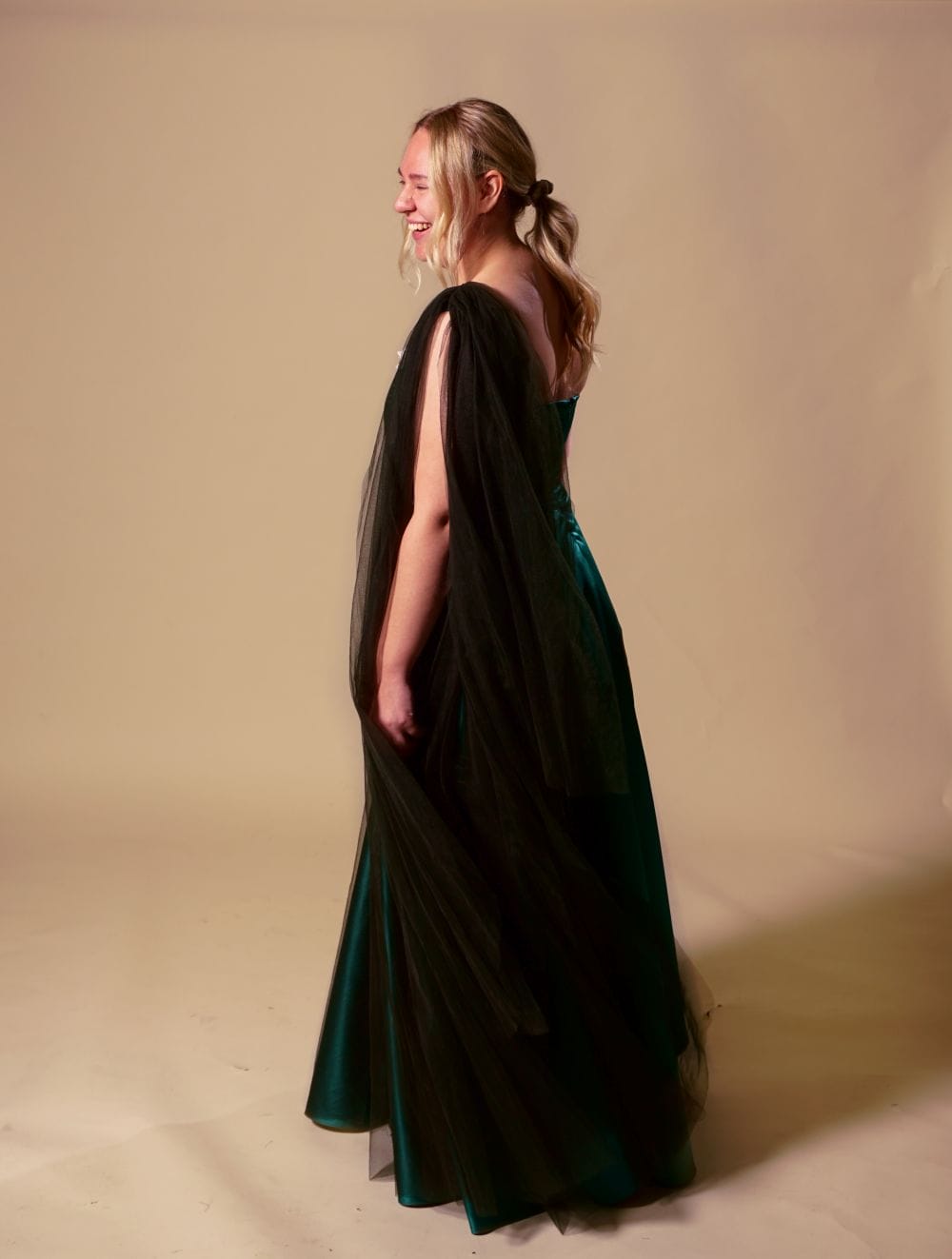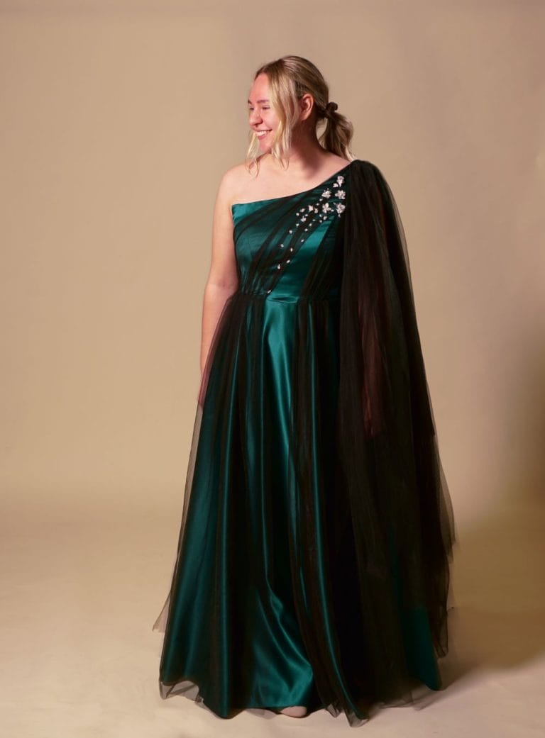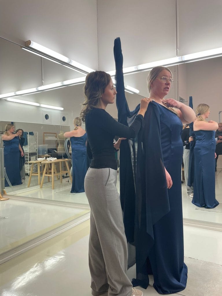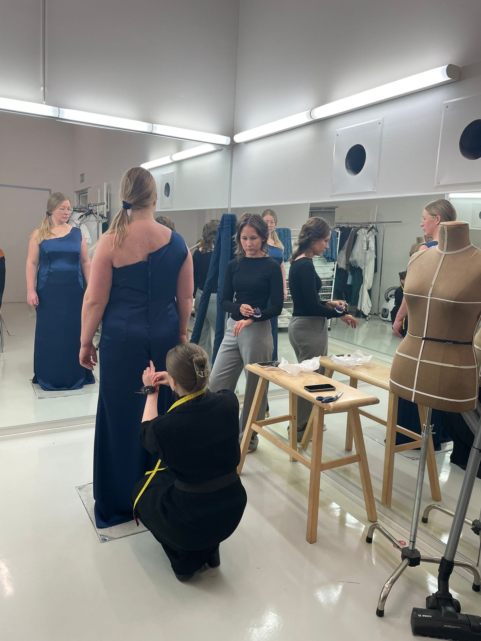 ”Meitä oli kaksi kiinnostunutta, jolloin sovimme ryhmätapaamisen asiakkaan kanssa ja aloimme suunnittelemaan mekkoja. Seuraavassa tapaamisessa esittelimme työmme ja annoimme hänelle pari päivää harkinta-aikaa, jonka jälkeen hän ilmoitti, että valinta osui minuun”, Elina valottaa prosessia.