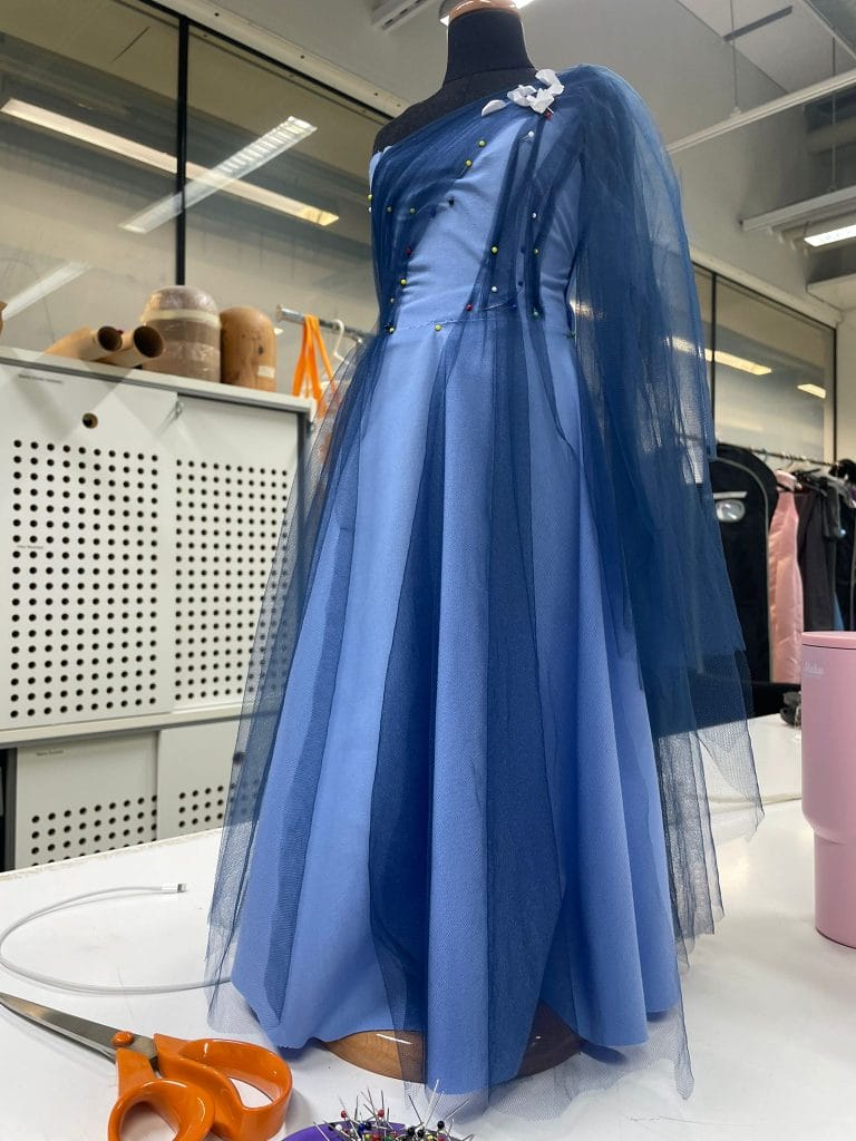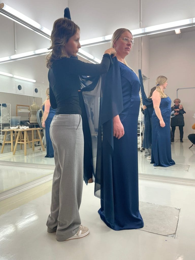 ”Anna-Kristiina toivoi yksiolkaimista pukua, jossa olisi viittamainen hiha oikean käden puolella, jotta se on näyttävä kättelytilanteessa. Väriksi valikoitui hänen lempivärinsä sininen, vaikka roosakin oli alkuun vaihtoehtona”, Anni kertoo.
