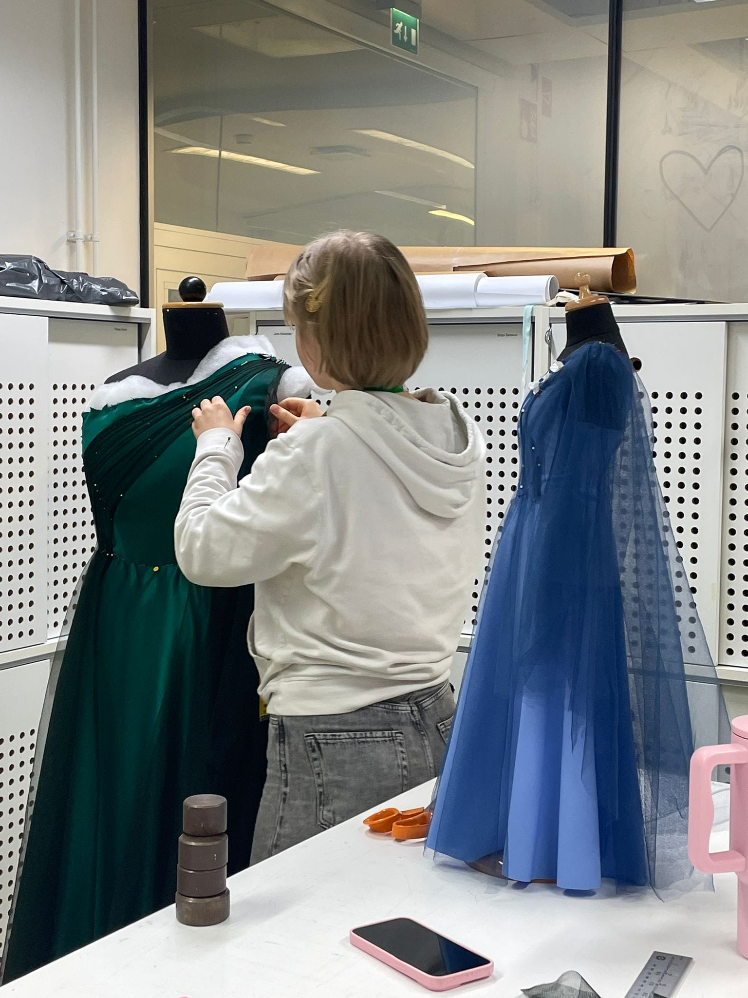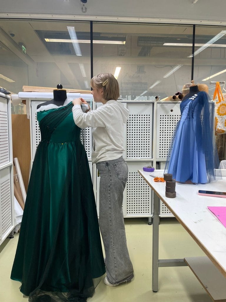 ”Projektin tuntimäärä ei koostu pelkästään puvun tekemisestä, vaan mukaan lasketaan kaikki tunnit, esimerkiksi materiaalinhankintamatkat ja Teams-puhelut asiakkaan kanssa”, hän valottaa.