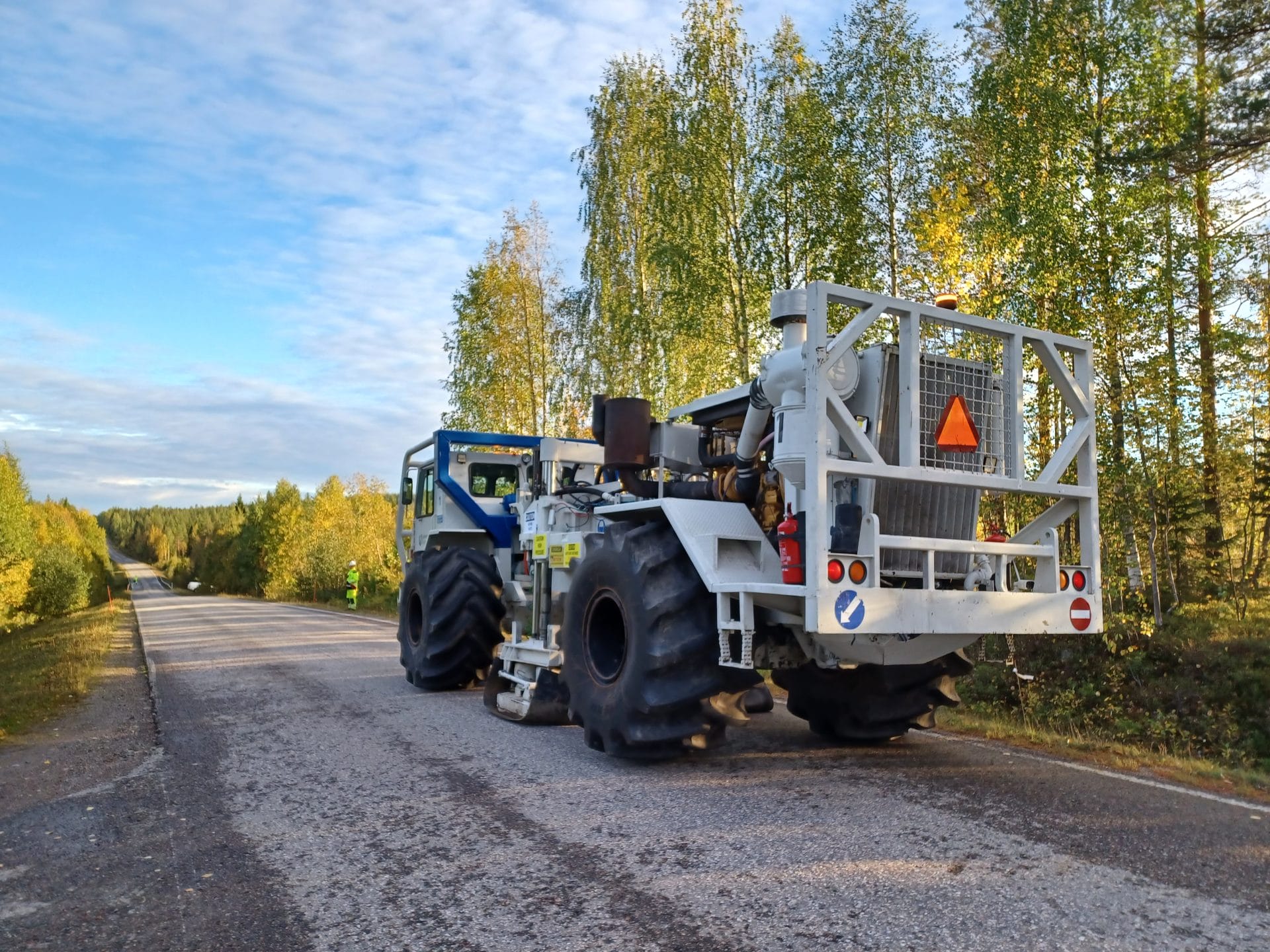 Heijastusseismisissä mittauksissa käytettävä tärytinauto painaa 29 tonnia. Tavallisilla seututeillä liikenne mahtuu kulkemaan tärytinauton ohi toisella kaistalla. Liikenteenohjaajat vuorottavat kulkuneuvot turvallisesti mittausalueen ohi. Kuva: Geologian tutkimuskeskus GTK.
