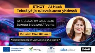 Tilaisuuden teemana on Tekoäly ja Tulevaisuus. Ohjelmassa futuristi Elina Hiltusen puheenvuoro tekoälystä ja tulevaisuuden työelämästä, katsaus ETKOT-hankkeen tuloksiin sekä osallistavassa osuudessa aikamatkataan yhdessä tulevaisuuden tekoäly-yhteiskuntaan.