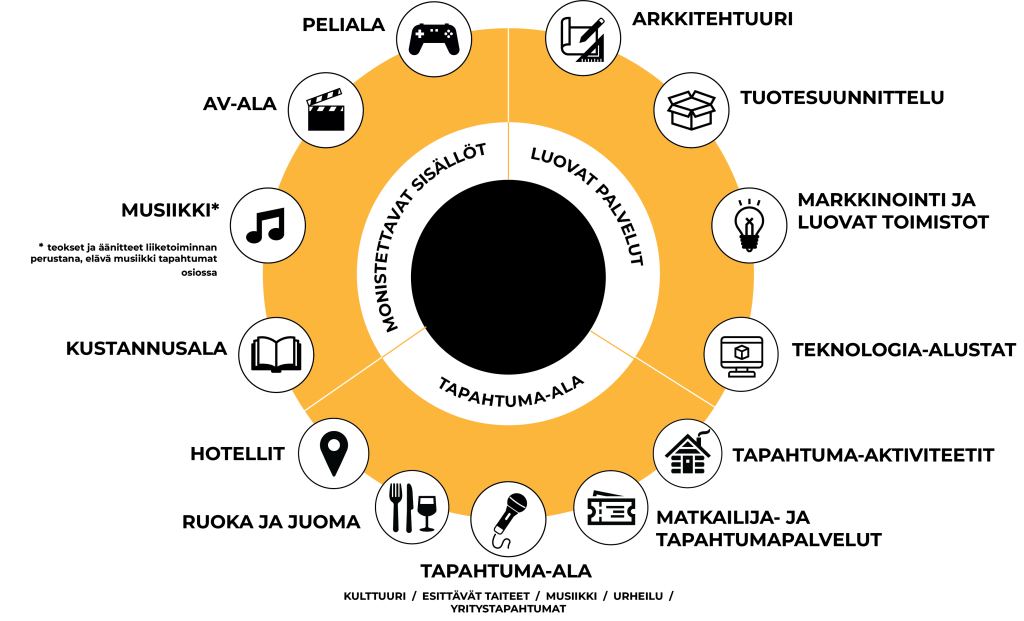Luovan talouden jako monistettaviin sisältöihin, luoviin palveluihin ja tapahtuma-alaan.