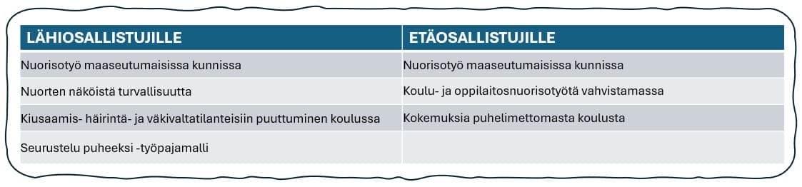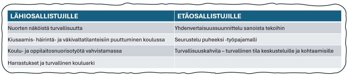 Kohderyhmä; koulujen ja oppilaitosten monialaisten kasvattajayhteisöjen jäsenet ja johtajat, sekä nuorisoalan ammattilaiset.