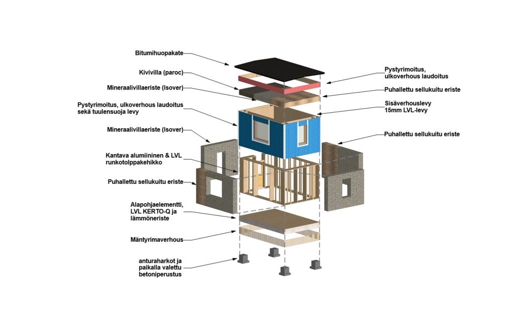 Kaksikerroksinen, 25 pohjaneliöinen tutkimusalusta on toteutettu oikeilla teollisilla materiaaleilla, liitoksilla ja toleransseilla. Noin 160 mittausanturia rakenteiden eri osissa ja kerroksissa keräävät dataa kosteudesta ja lämpötilasta sekä rakenteiden muista ominaisuuksista.