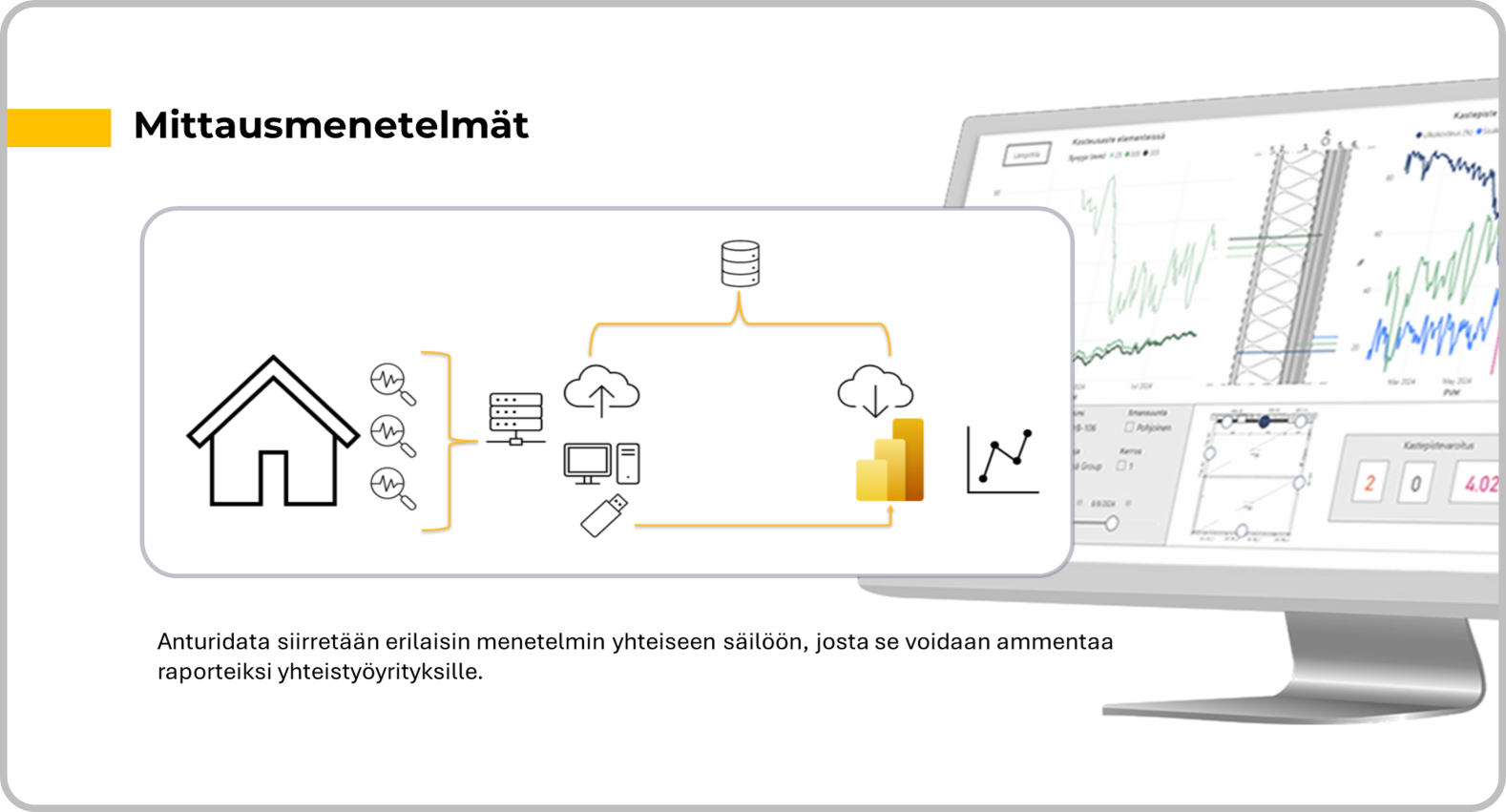 Testitalojen anturointijärjestelmillä saadaan mitattua tarkasti rakenteiden lämpö- ja kosteuskäyttäytymistä, sekä ilma- ja höyrytiiveyttä. Lisäksi seurataan rakennusten hiilidioksidi-, pienhiukkas- ja VOC-arvoja.