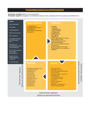 Päivittäistä toimintaa ohjaavat tunnistetut ja kuvatut prosessit, johtoryhmien ja työryhmien päätökset sekä erilaiset ohjeet. Yhtenäisillä toimintatavoilla var-mistamme toiminnan tasalaatuisuuden, vastuullisen ja kestävän toiminnan sekä tunnistettujen riskien hallinnan ja ennakoinnin.