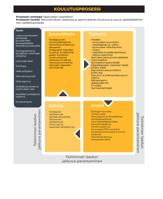 Ydinprosessimme ovat koulutus- ja TKI-prosessit. Tukiprosessimme ovat toiminnanohjaus ja tukipalvelut, jotka luovat edellytyksiä ydinprosessien onnistumiselle ja tukevat toimintaa. Sekä ydin- että tukiprosessit jakautuvat osaprosesseihin ja prosessit kuvataan IMS-toimintajärjestelmään yhteisen kuvausohjeen mukaisesti. Prosessikuvauksilla tuetaan toiminnan sujuvuutta, tavoitteiden saavuttamista sekä asiakastarpeisiin vastaamista. Ne myös yhdenmukaistavat ja selkeyttävät toimintaamme.