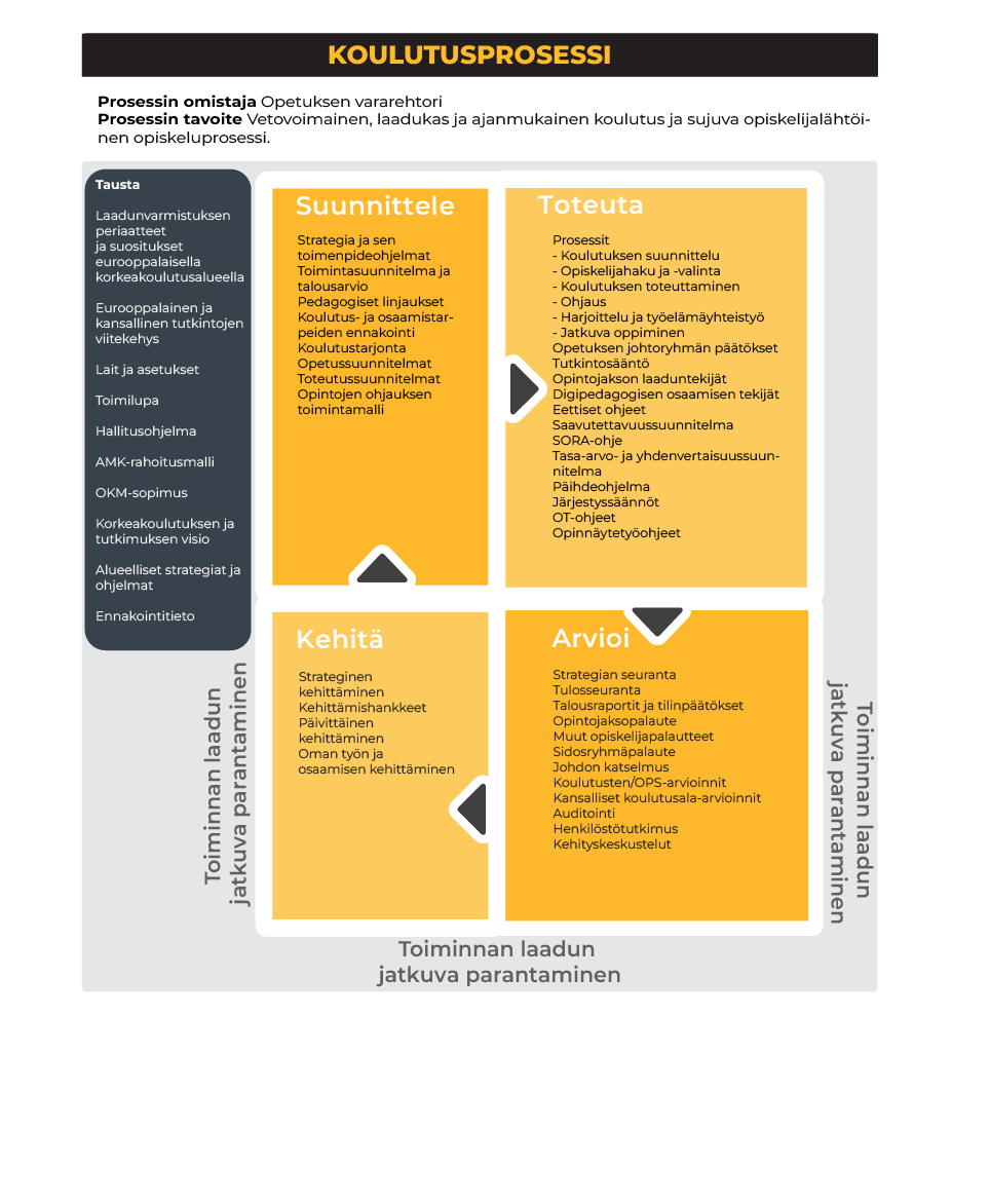 - Laatupäällikkö 22.11.2021. Muutettu: ydinprosessit koulutus ja tki. Toiminnanohjaus tukiprosessi. Muutettu nimi. Arviointi ja palautejärjestelmä. Tasa-arvo ja yhd.vert.suunn. joka toinen vuosi.