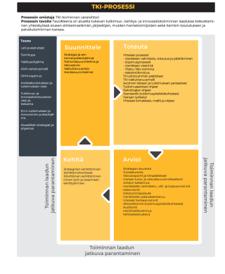 Kehittämistyötä tehdään ulkoisella rahoituksella toteutettavina TKI- tai ei-TKI-hankkeina, omalla rahoituksella toteutettavina kehittämisprojekteina ja osana normaalia toiminnan jatkuvaa kehittämistä. Kehittämistarpeita tunnistetaan ja analysoidaan, kehittämisen kohteista sovitaan, edistymistä seurataan ja tuloksia esitellään ja jaetaan mm.