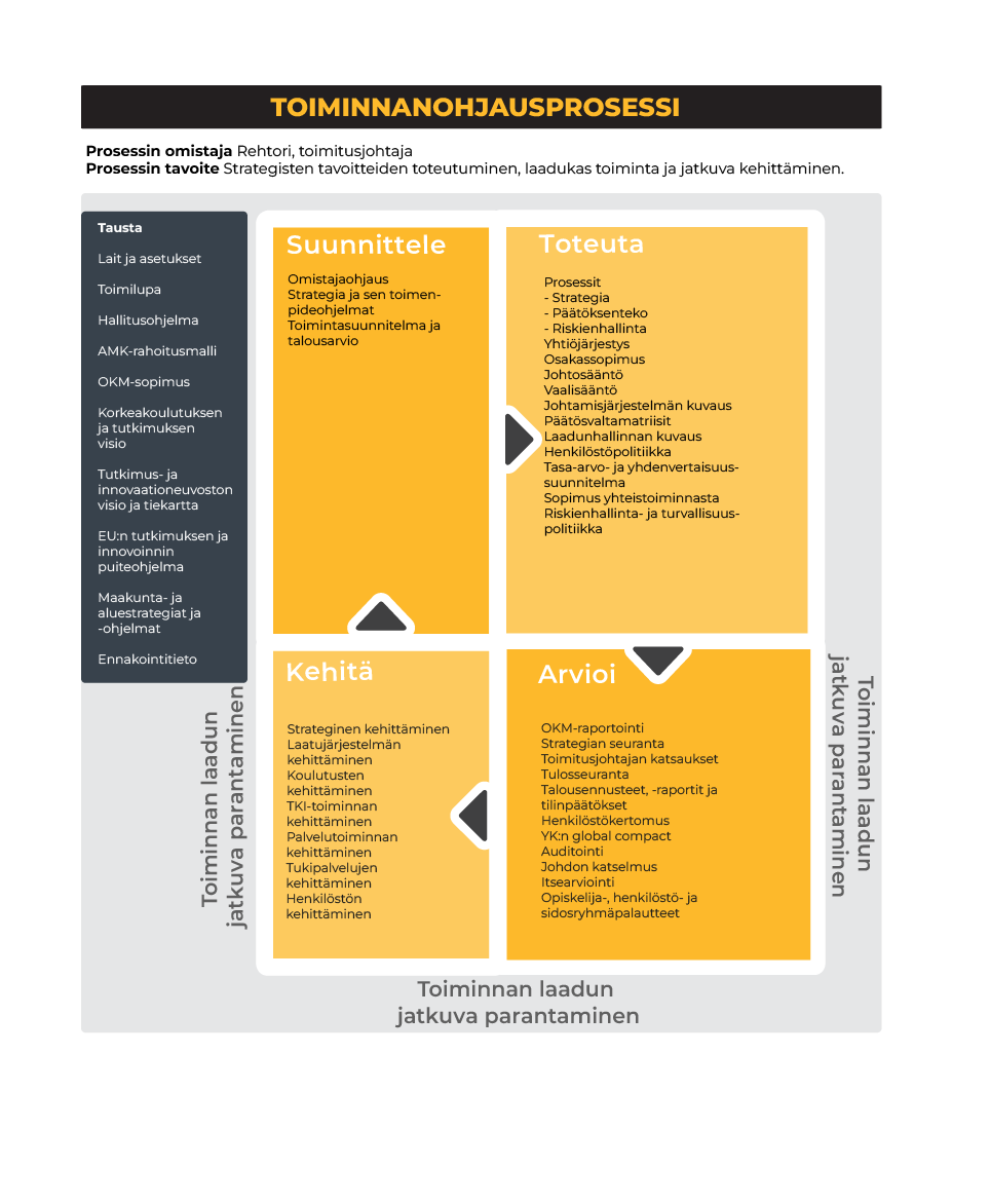 Xamkin laatujärjestelmä kytkeytyy strategiseen johtamiseen ja on osa toiminnanohjausta. Toiminnanohjauksella varmistetaan strategian, tavoitteiden ja suunnitelmien konkretisoituminen toimenpiteiksi sekä seurataan ja arvioidaan tavoitteiden toteutumista, kuva Toiminnanohjausprosessi. Laadukas toiminta varmistaa Xamkin yhteiskunnallisen vaikuttavuuden ja on tärkeä kilpailutekijä.