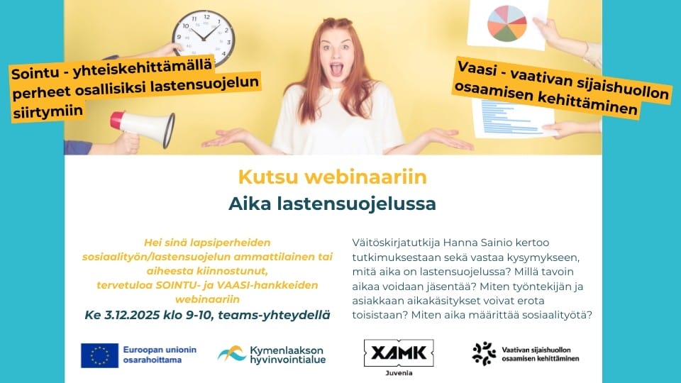Aika lastensuojelussa webinaari 3.12.2025 klo 9-10. Ilmoittaudu tästä: https://link.webropolsurveys.com/S/AE8A738E570D31BB