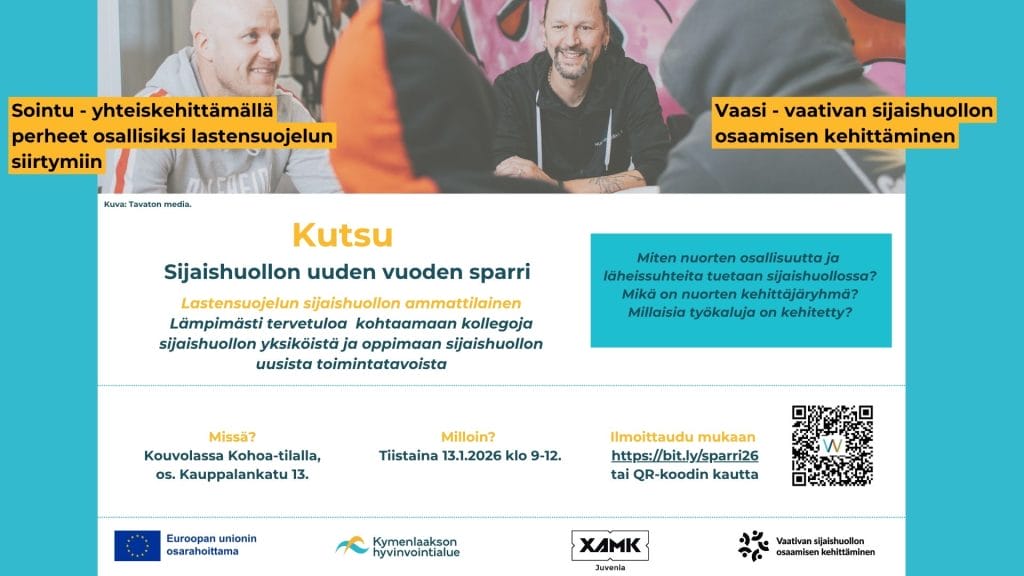 Sijaishuollon sparri 13.1.2026 klo 9–12 Kohoalla, Kouvolassa os. Kauppalankatu 13 (Xamk:n tila). Voit ilmoittautua sparriin tästä https://link.webropolsurveys.com/S/8D81B0C95349B4BB