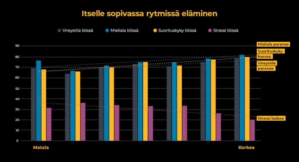 Omaan vuorokausirytmiin perustuva työn tuunaaminen oli positiivisesti yhteydessä töissä koettuun vireystilaan, mielialaan ja suorituskykyyn sekä käänteisesti yhteydessä stressiin. Tällä on merkittävä yhteys työelämänlaatuun ja sen kautta tuottavuuteen.